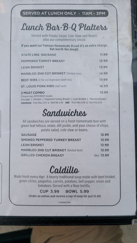 Introducing The State Line, a barbecue joint in El Paso, TX that offers a diverse menu with many vegetarian options. This casual yet classy spot is wheelchair accessible and perfect for groups and kids. The State Line's menu features savory options like BBQ Chicken, Beef Ribs, Brisket, Sausage, and St. Louis Pork Ribs. Don't miss out on their BBQ Emergency Kit, a hearty meal for one with a selection of meats and sides. The Homemade Bread appetizers are a must-try and the full bar with happy hour specials is a great addition. Whether you're dining in or ordering delivery, The State Line is a great choice for delicious barbecue in a welcoming atmosphere.